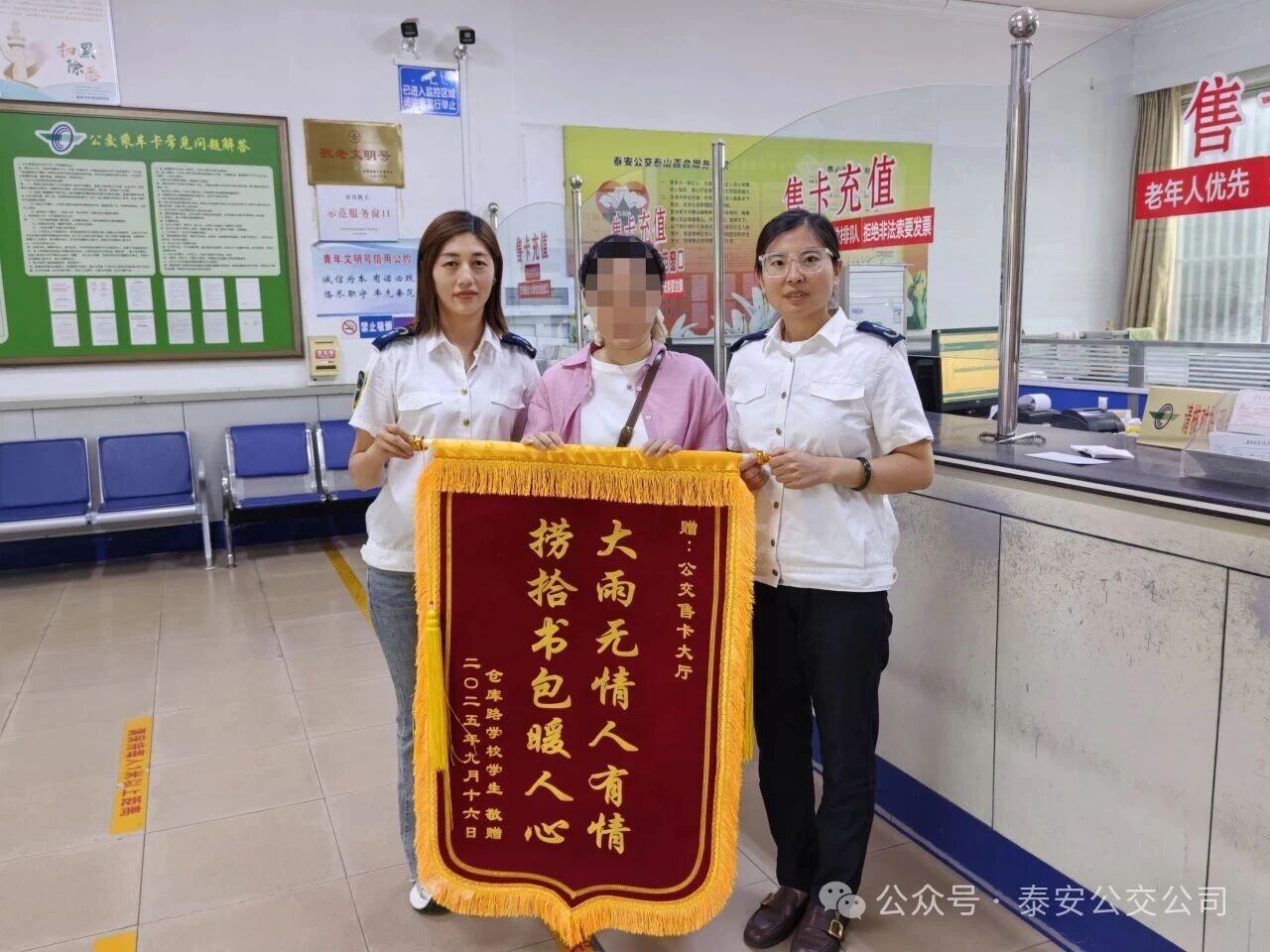第二天下午,家長特意帶著一面錦旗來到泰山百合服務(wù)廳,贈予大廳工作人員,贊揚她們“大雨無情人有情 撈拾書包暖人心”的暖心行為。面對家長的堅持,工作人員接過錦旗,心里涌起一陣溫暖——沒想到這小小的舉手之勞,能收獲家長如此真摯的肯定。