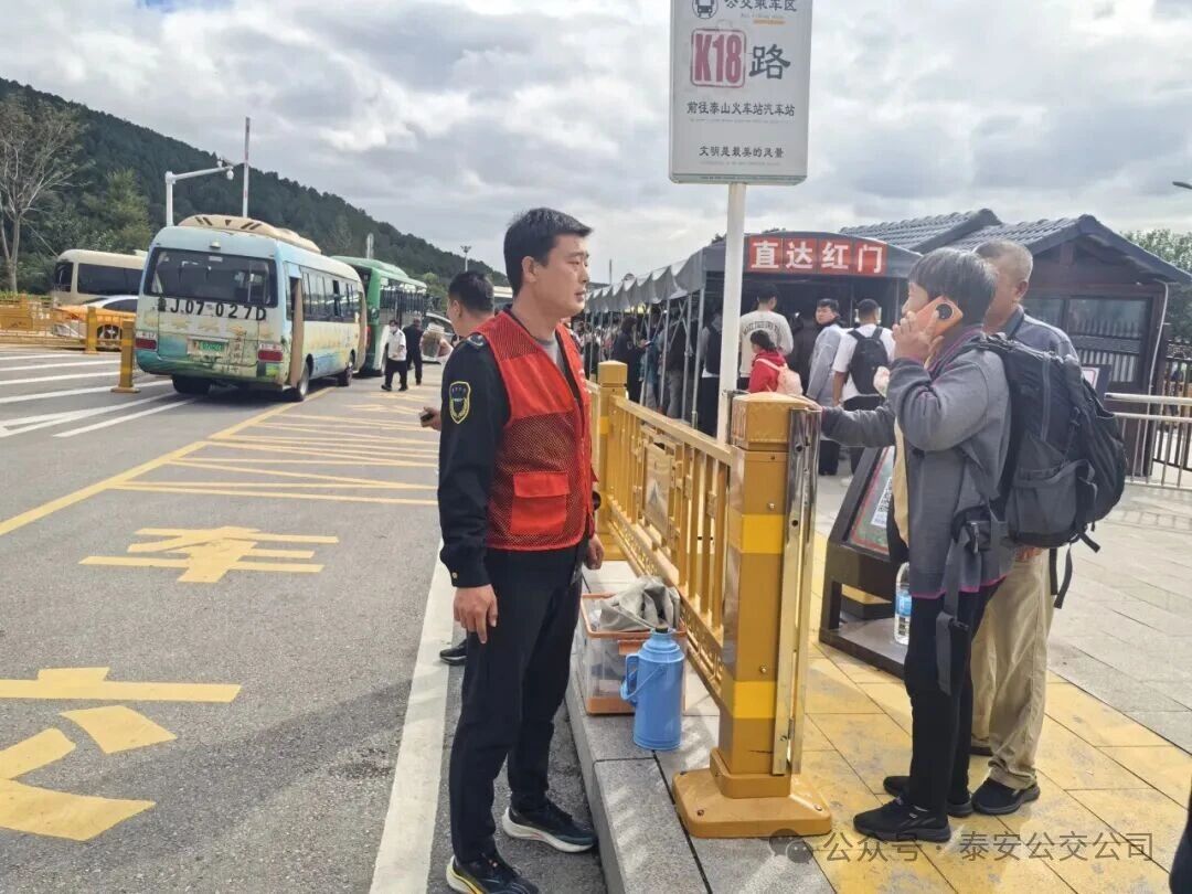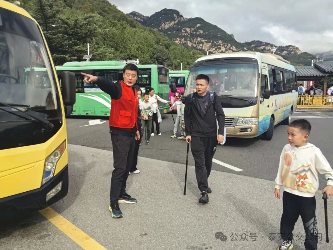 國(guó)慶的天外村是泰山腳下最熱鬧的角落之一。游客背著行囊奔赴山間,公交站臺(tái)作為景區(qū)接駁“樞紐”,成了人流最密集的地方。熙熙攘攘中,宋旭的紅色馬甲格外顯眼:公交車駛來,他上前引導(dǎo)???;游客持地圖張望,他主動(dòng)答疑;車輛下客間隙,他俯身檢查輪胎、制動(dòng),不放過任何細(xì)節(jié)。