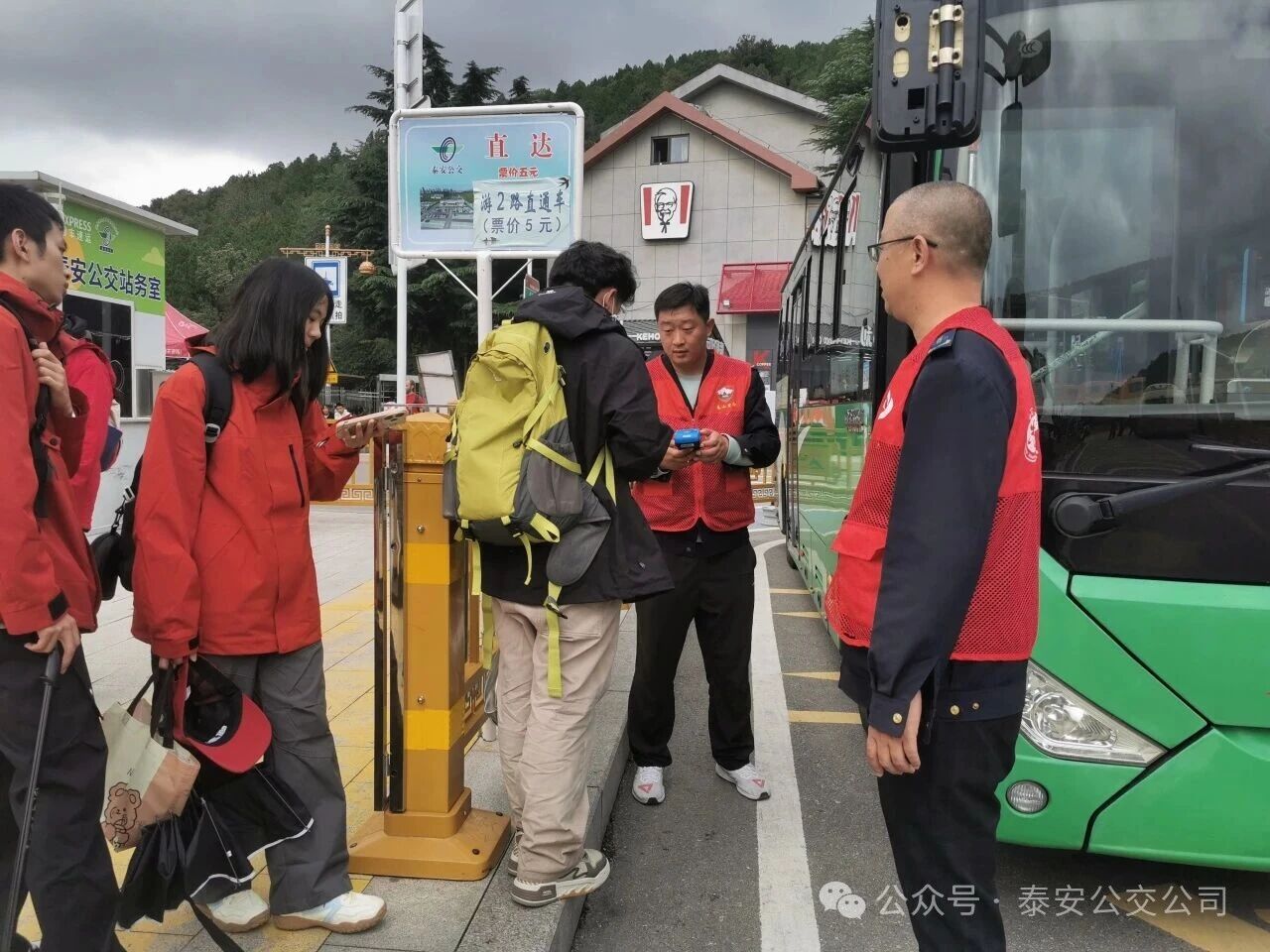 作為泰山景區(qū)重要疏散樞紐的桃花峪公交停車場,同樣活躍著“泰山百合”志愿者的身影。清晨,30名志愿者便到崗就位,分為問詢引導(dǎo)、幫扶協(xié)助、秩序維護(hù)小隊:為游客解答登山路線與乘車疑問,攙扶老年乘客上下車、幫攜帶行李的游客搬運(yùn)行李,還配合維護(hù)候車與發(fā)車秩序,用細(xì)致服務(wù)為游客疏運(yùn)注入溫暖。