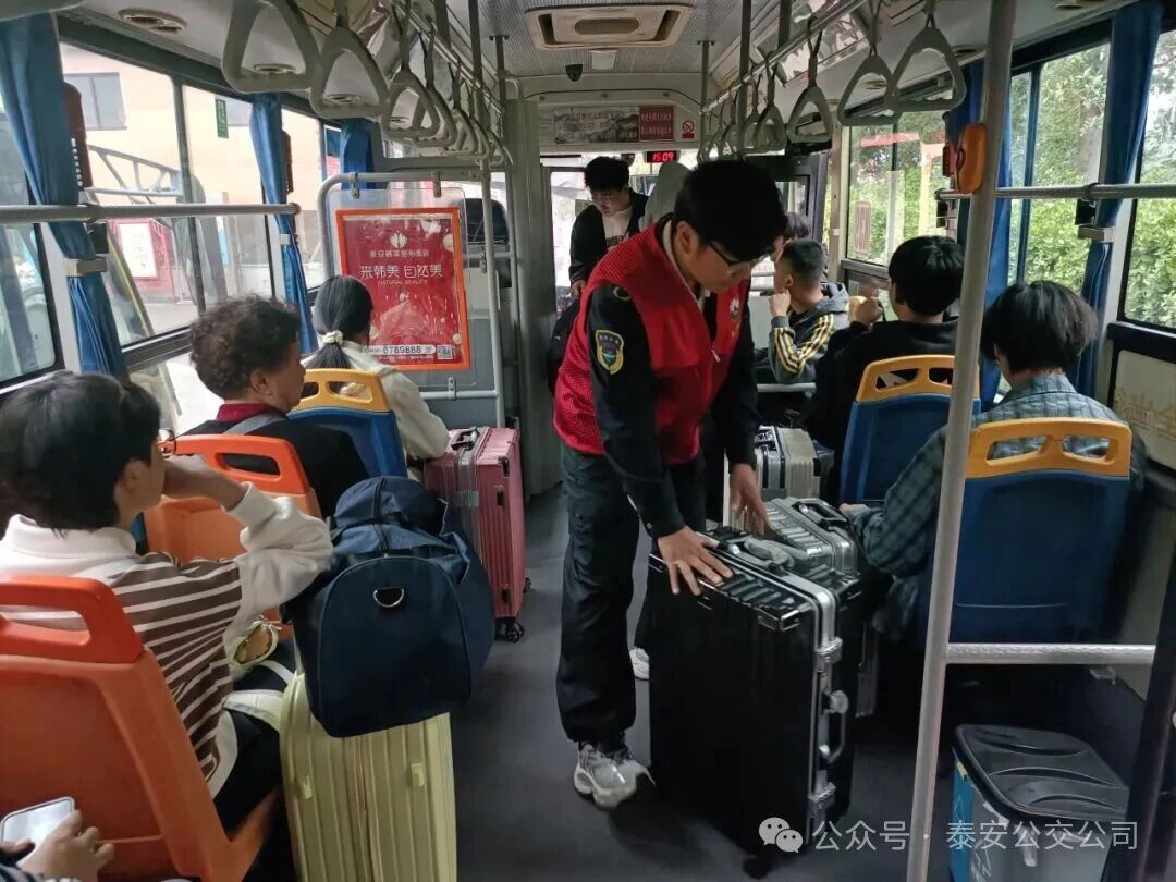 針對泰城東部高校節(jié)假日前后“集中放假、集中返校”的出行規(guī)律,根據(jù)以往經(jīng)驗掌握返校學生客流量、高峰時段等需求信息。第三分公司提前部署,科學調(diào)配運力,安排好駕駛員、公交志愿者,以及車輛儲備、實時調(diào)度工作。在泰山火車站公交樞紐站的直通車服務(wù)點,醒目的“火車站—山東服裝學院—泰山職業(yè)學院—泰山科技學院”線路標識牌擺放在車前,讓剛下火車的學子們一眼就能找到乘車點。公交志愿者們主動上前,一邊引導學生有序排隊候車,一邊協(xié)助將行李箱規(guī)范擺放在車廂內(nèi)。“放假回家時坐直通車到泰山火車站,現(xiàn)在返校又能從泰山火車站直達校門口,不用拎著大包小包轉(zhuǎn)車換乘,太省心了!”來自泰山科技學院的一名學生笑著說道,話語里滿是對直通車服務(wù)的贊許。
